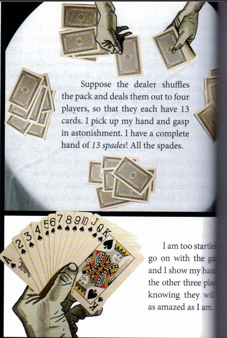 احتمالا به وجود آمدن هر دستی دقیقاً همان عدد بالا است. اما ما متوجه بقیه دستها نمیشویم، زیرا برایمان زیادی معمولی به نظر میرسند و الگوی ندارند. ما تنها متوجه آنچیزی میشویم که به شکل برجستهای در میان این دستها خودش را نشان میدهد.